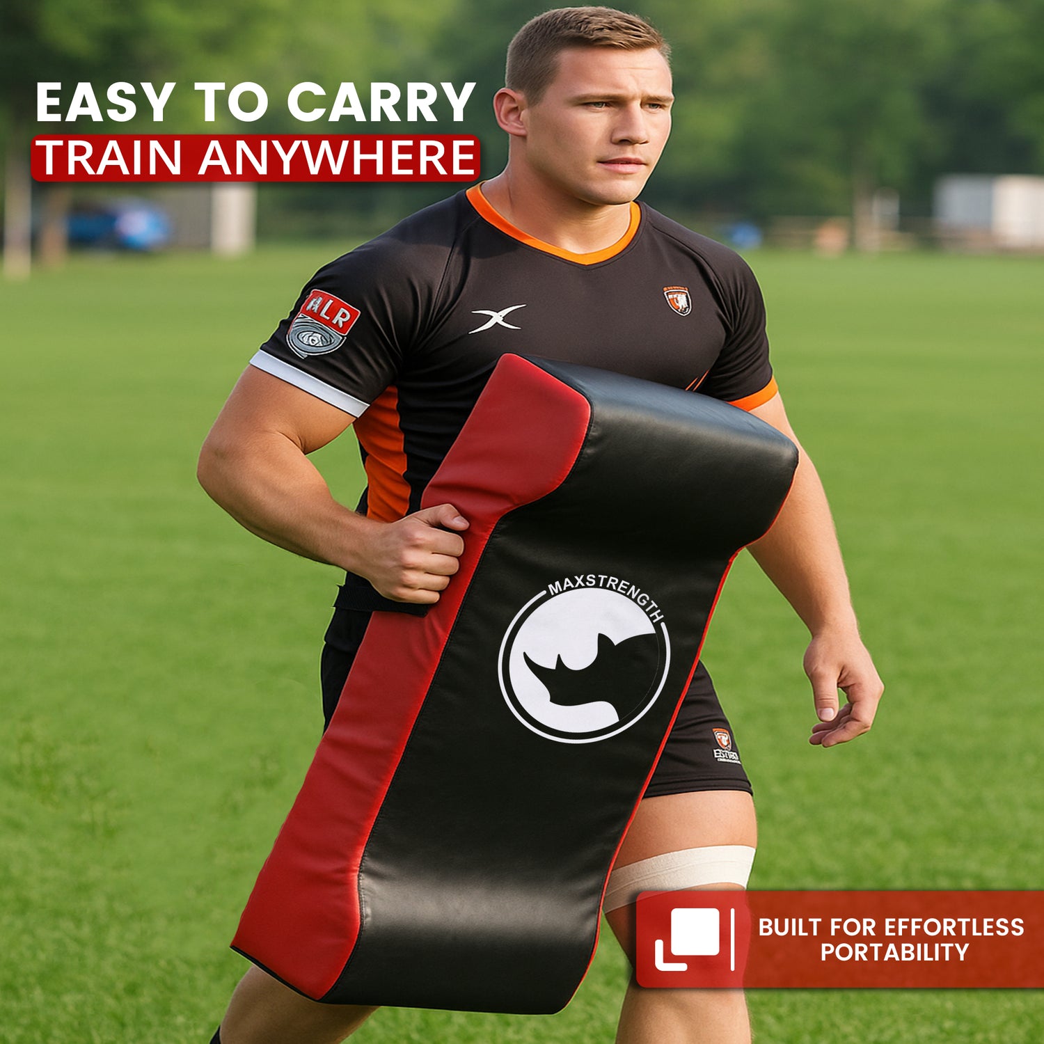 MAXSTRENGTH Rugby Hit Shield is built with multi-layer high-density foam padding for maximum shock absorption and impact safety. Covered in durable synthetic leather, it features strong handles and extended double straps for a secure, cushioned grip during training.