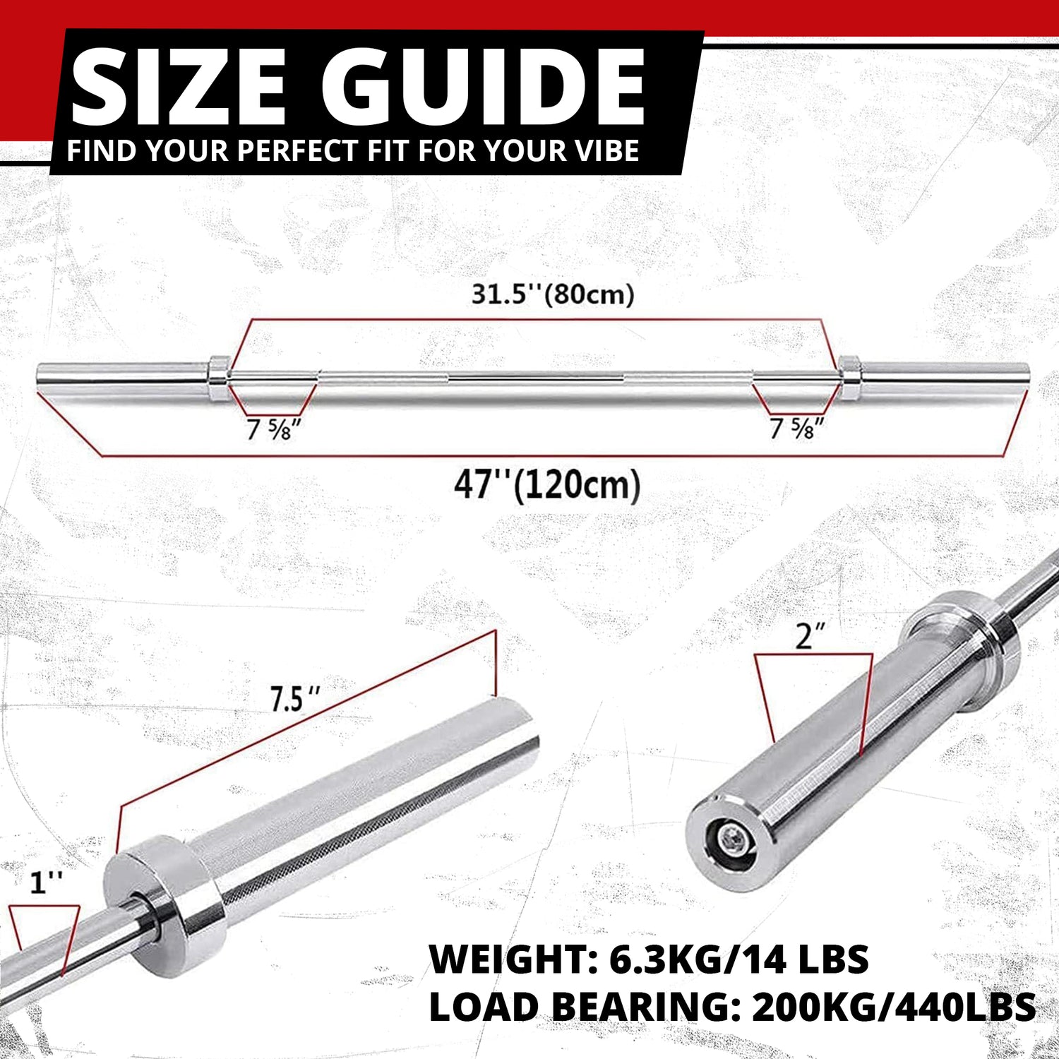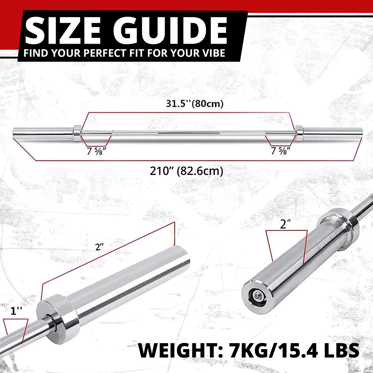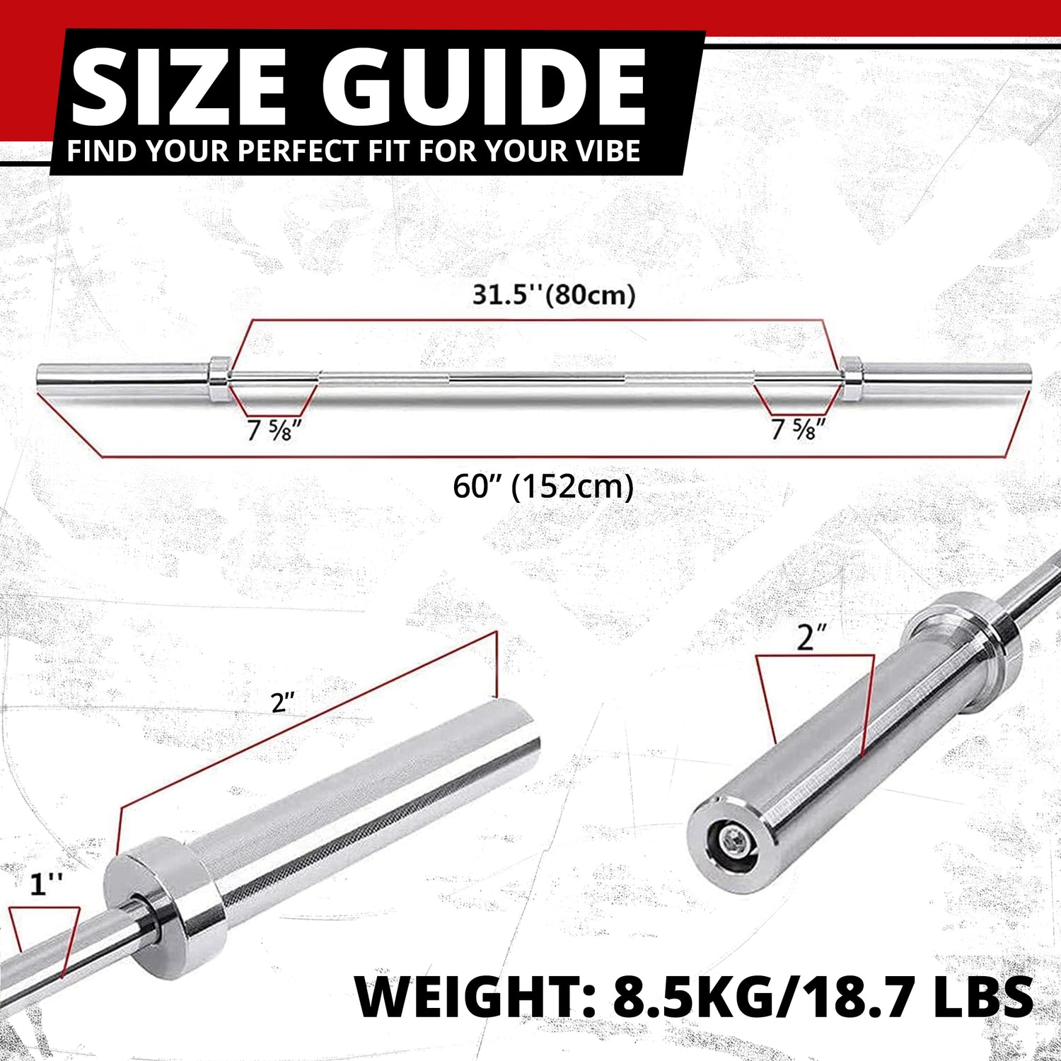 DIMENSIONS: Comes in 4ft (120cm), 5ft (152cm), 6ft (183cm) and 7ft (218cm) Versions. Sleeve Length: 17cm, 27cm, 32cm, 40cm. Length of Middle Bar: 82.5cm, 93cm, 114cm, 132cm. Middle Bar Diameter: 2.5cm, Sleeve Diameter: 5cm. Measurements May Differ Slightly From Dimensions Image. Bar Weights: 7.4kg, 11.3kg, 13kg, 16.6kg. Included: 1 Olympic Bar, 2 Spring Clip Collars.
