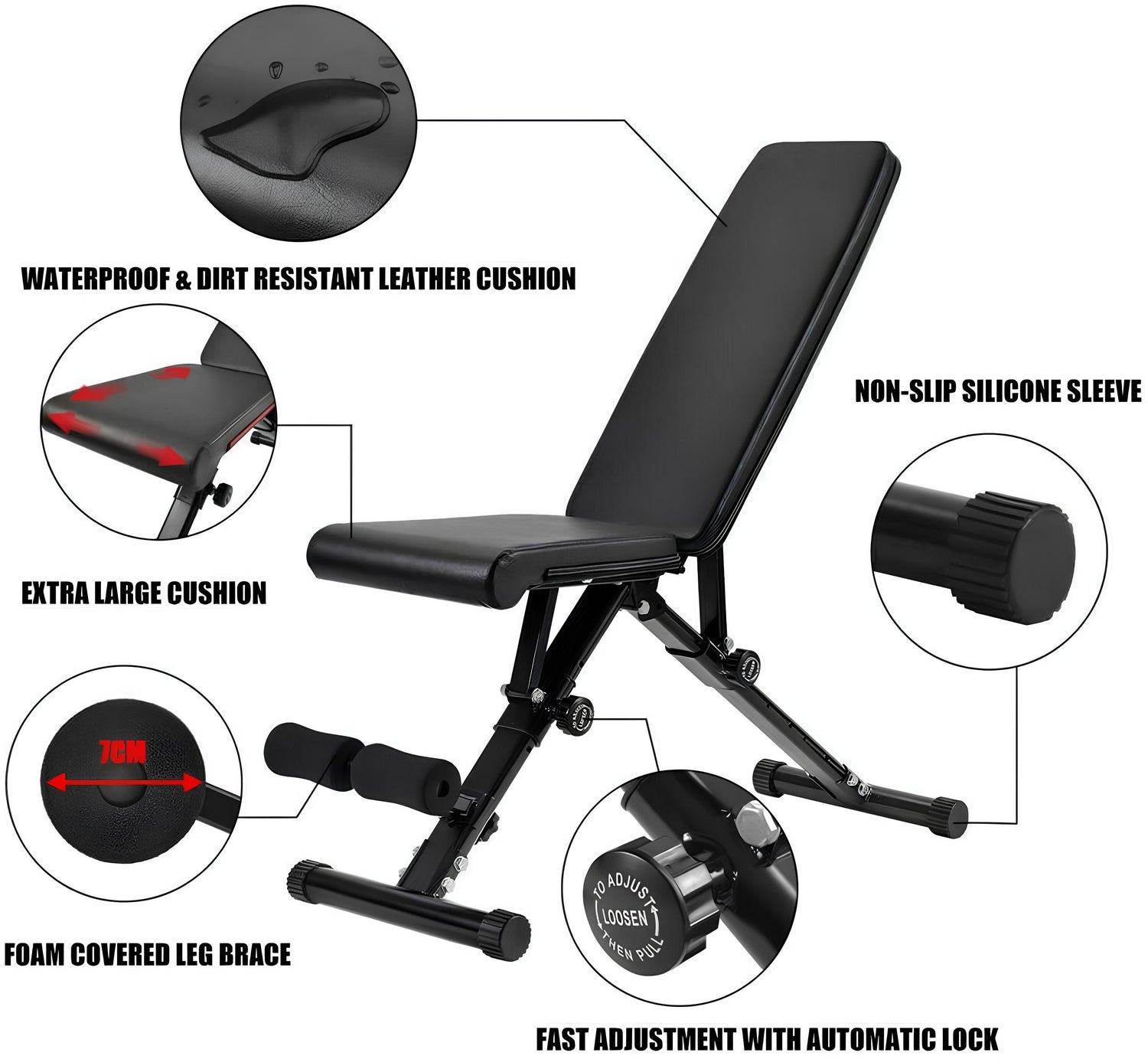 PERFECT FOR A FULL-BODY WORKOUT - This multi workout weight lifting bench foldable can provide you a variety of exercise, perfect for biceps curls, bench press, shoulder press, ab muscle training, leg exercise and more. It's a great device for a full-body workout at home or at gym.